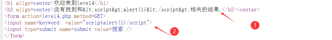 由网页源代码,①使用了htmlspecialchars($str)过滤。②则是把<>给过滤掉了