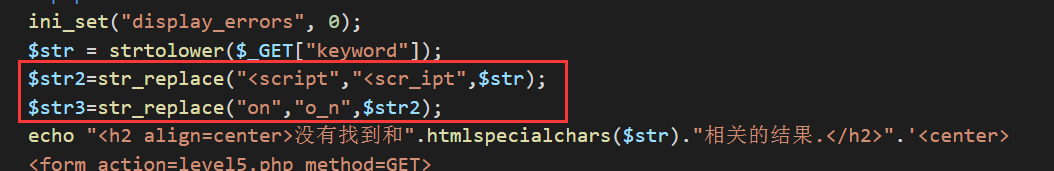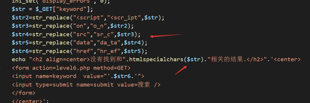由后台代码可以知道,后台对特定的字符进行转换(并没有把字符串准换为小写来进行过滤),以及htmlspecialchars($str)过滤。