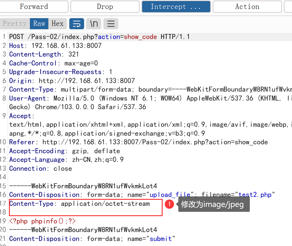 - 把编辑好的脚本改成jpg格式,抓取上传的包,修改filename的文件格式为php,即可上传脚本成功。